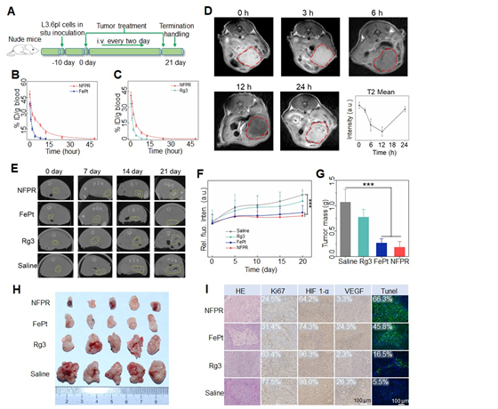 图4 小鼠静脉注射纳米中药FePt@FePtOx-Rg3的成像效果和对其抗癌疗效机制的活体示踪测试。(A)活体动物实验方案。(B)静脉注射FePt纳米粒子和NFPR纳米药物后血浆中Fe浓度时间变化曲线(n=3)。(C)静脉注射Rg3和NFPR纳米药物后血浆中Rg3浓度时间变化曲线(n=3)。(D)静脉注射NFPR纳米药物后肿瘤处MRI的T2WI权重随时间变化曲线(B0 = 7.0 T)。(E)不同药剂给药后在不同时间点(0天、7天、14天、21天)时肿瘤处的CT扫描图像。(F)不同药剂给药后肿瘤部位生物发光图像的定量分析。(G)不同药物处理21天后小鼠肿瘤组织的最后重量(n = 5)。(H)不同用药方式21天后取出的肿瘤离体图像。(I)不同对照组小鼠肿瘤组织切片的H&E、Ki67、HIF 1-α、VEGF和TUNEL染色分析。